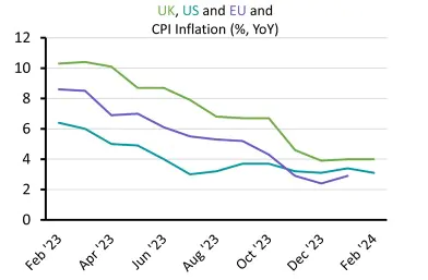 Government bond markets experienced high levels of volatility as contrasting inflation readings in the US and UK cast doubt on the timing of central bank interest rate cuts. Headline consumer inflation in the US dropped from an annual rate of 3.4% to 3.1% but this was higher than expected due to rising costs of housing and services. Monthly CPI and core inflation (excluding more volatile food and energy costs) were also higher than expected. The inflation numbers added to doubts that the Federal Reserve would cut interest rates in the spring and caused government bonds and US equities to fall.