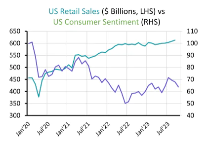 This week the outlook for the UK and the US rests in part on consumer confidence and how that might translate to spending which will ultimately result in economic growth. Although confidence appears to have unexpectedly improved in the UK, there is another energy price cap increase hike coming in January 2024. Meanwhile, US consumer confidence has weakened slightly and some of the data points to a slowdown in retail spending. US markets were positive in advance of the Thanksgiving holiday and investors will be looking at whether this positivity carries through to the annual retail spending bonanza that is Black Friday.